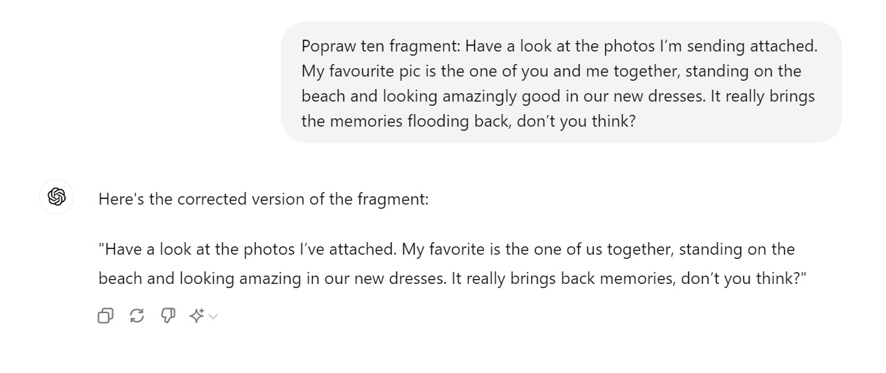 Dlatego warto korzystać z ChatGPT w inny sposób. Możemy wkleić mu swój tekst i poprosić o sugestie poprawek w zakresie stylu pisania czy najróżniejszych błędów. Możemy także poprosić go o podpowiedź, jak dany tekst napisać, jaką powinien mieć strukturę, etc.